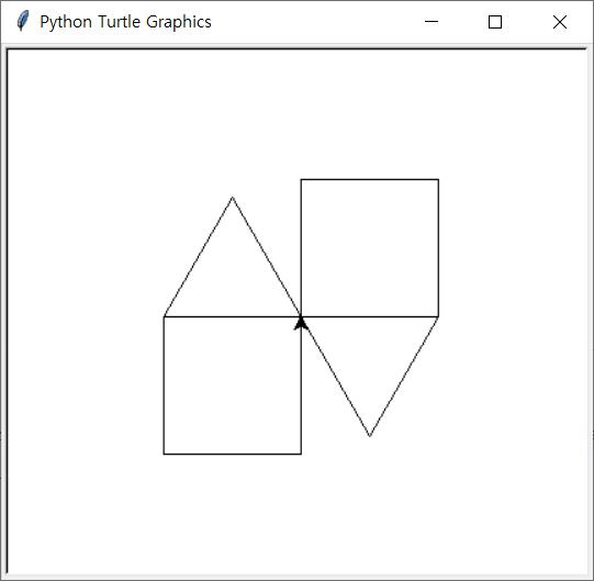 ν¨μλ₯Ό νΈμΆν©λλ€.μ μ½λμμ μΌκ°νμ 그리λ triangle() ν¨μμ μ¬κ°νμ 그리λ square() ν¨μλ₯Ό μ μν©λλ€. λ ν¨μλ₯Ό λΆλ¬μ€λ©° t.right(90) λͺ λ Ήμ΄λ₯Ό μ΄μ©νμ¬ κ·Έλ¦¬λ λ°©ν₯μ λ°κΎΈμ΄μ€λλ€.