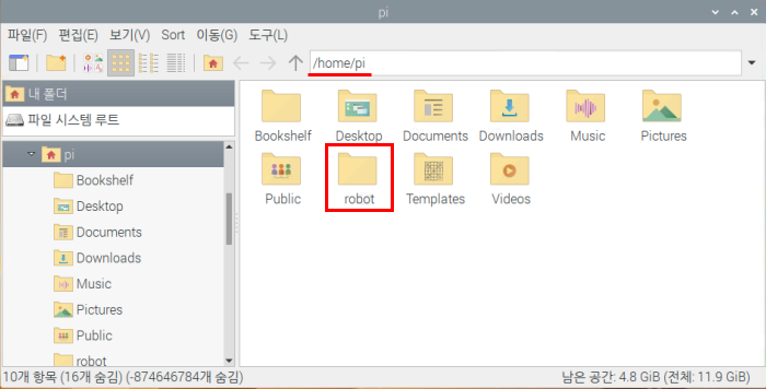 ๋ง๋ค์ด์ง ํด๋ ํ์ธ /home/pi ํด๋ ์์ [robot] ํด๋๊ฐ ๋ง๋ค์ด์ง ๊ฒ์ ๋ณผ ์ ์์ต๋๋ค. ์์ผ๋ก Thonny Python IDE์์ ํ๋ก๊ทธ๋จ์ ๋ง๋ค ๊ฒฝ์ฐ์๋ ์ [robot] ํด๋ ์์ ์ ์ฅํ๋๋ก ํฉ๋๋ค.