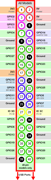 ์ถ์ฒ: https://gpiozero.readthedocs.io ์ ์ 2๊ฐ์ 5Vํ๊ณผ 2๊ฐ์ 3.3Vํ, 8๊ฐ์ 0V GNDํ์ด ์์ต๋๋ค.