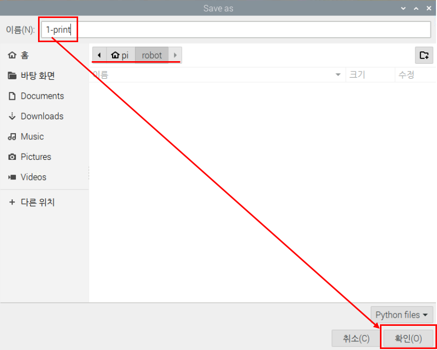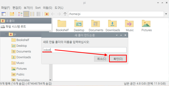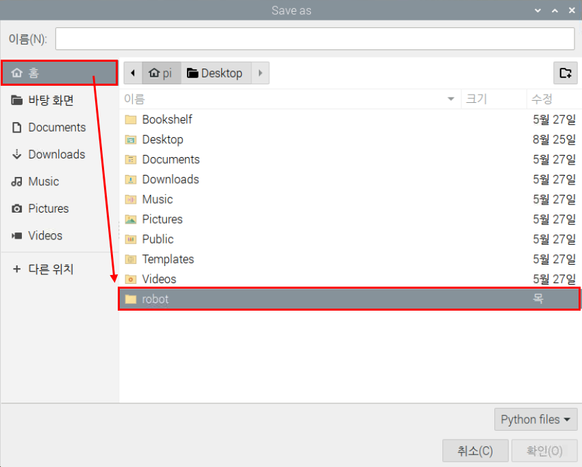 ๋ง๋ค์ด์ง ํด๋ ํ์ธ /home/pi ํด๋ ์์ [robot] ํด๋๊ฐ ๋ง๋ค์ด์ง ๊ฒ์ ๋ณผ ์ ์์ต๋๋ค. ์์ผ๋ก Thonny Python IDE์์ ํ๋ก๊ทธ๋จ์ ๋ง๋ค ๊ฒฝ์ฐ์๋ ์ [robot] ํด๋ ์์ ์ ์ฅํ๋๋ก ํฉ๋๋ค.