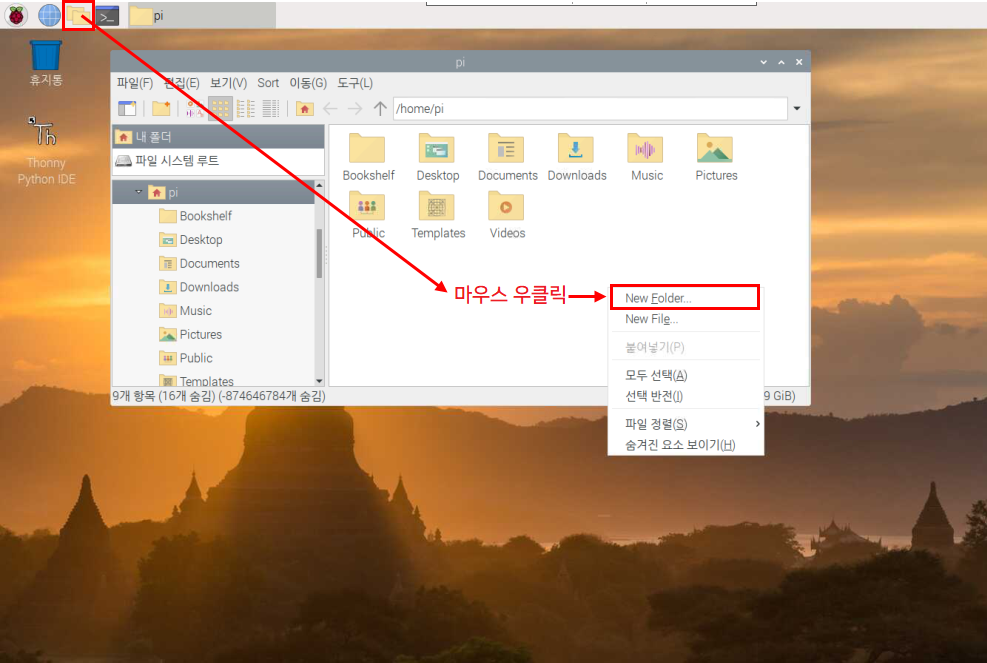 New Folder ๋ฐํํ๋ฉด์์ ํด๋ ์์ด์ฝ์ ํด๋ฆญํ์ฌ /home/pi ํด๋ ์์ ์๋ก์ด ํด๋๋ฅผ ๋ง๋ญ๋๋ค. ์๋ก์ด ํด๋๋ฅผ ๋ง๋ค ํด๋ ์์์ [๋ง์ฐ์ค ์ฐํด๋ฆญ] - [New Folder]๋ฅผ ์คํํฉ๋๋ค.