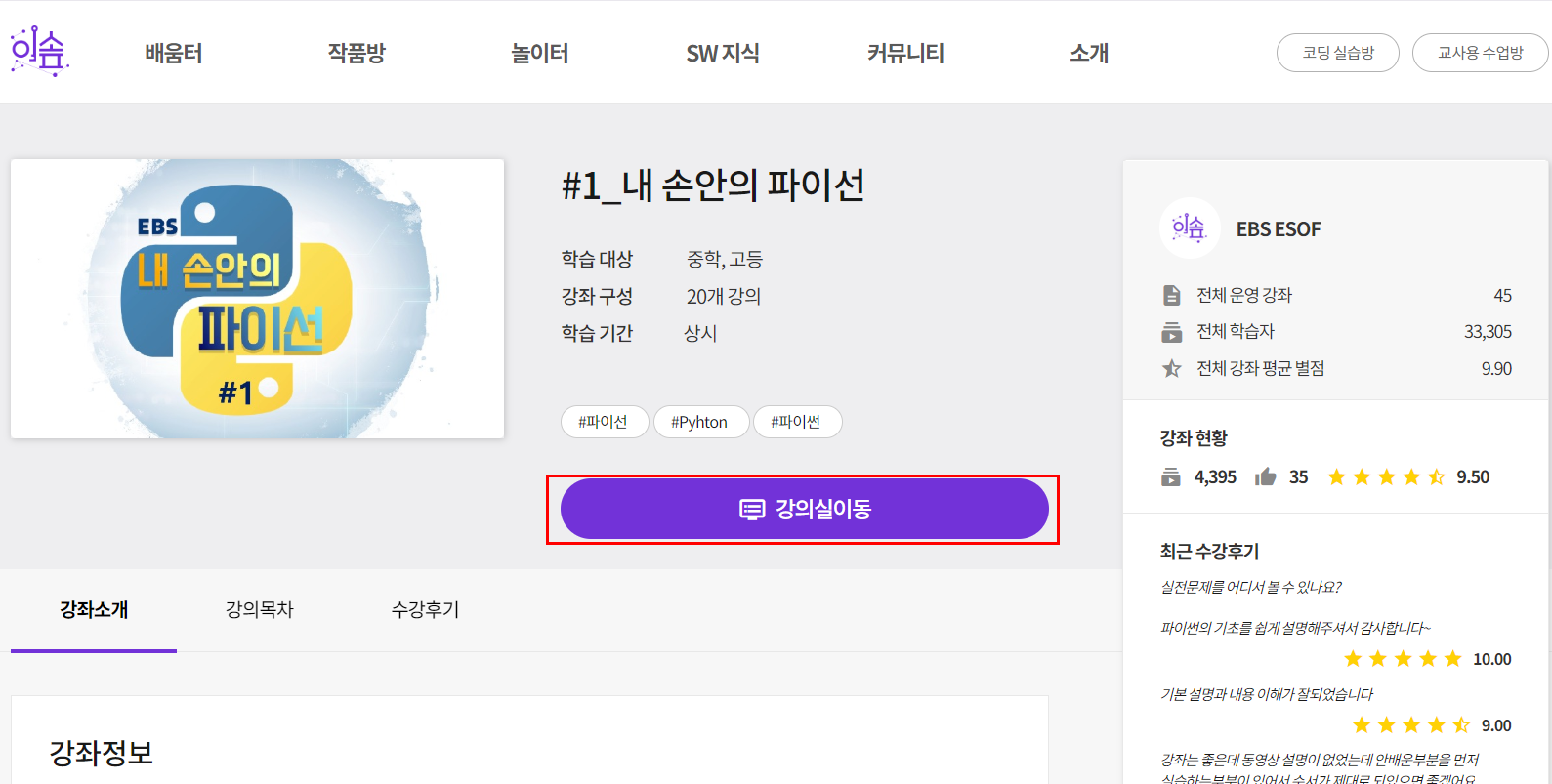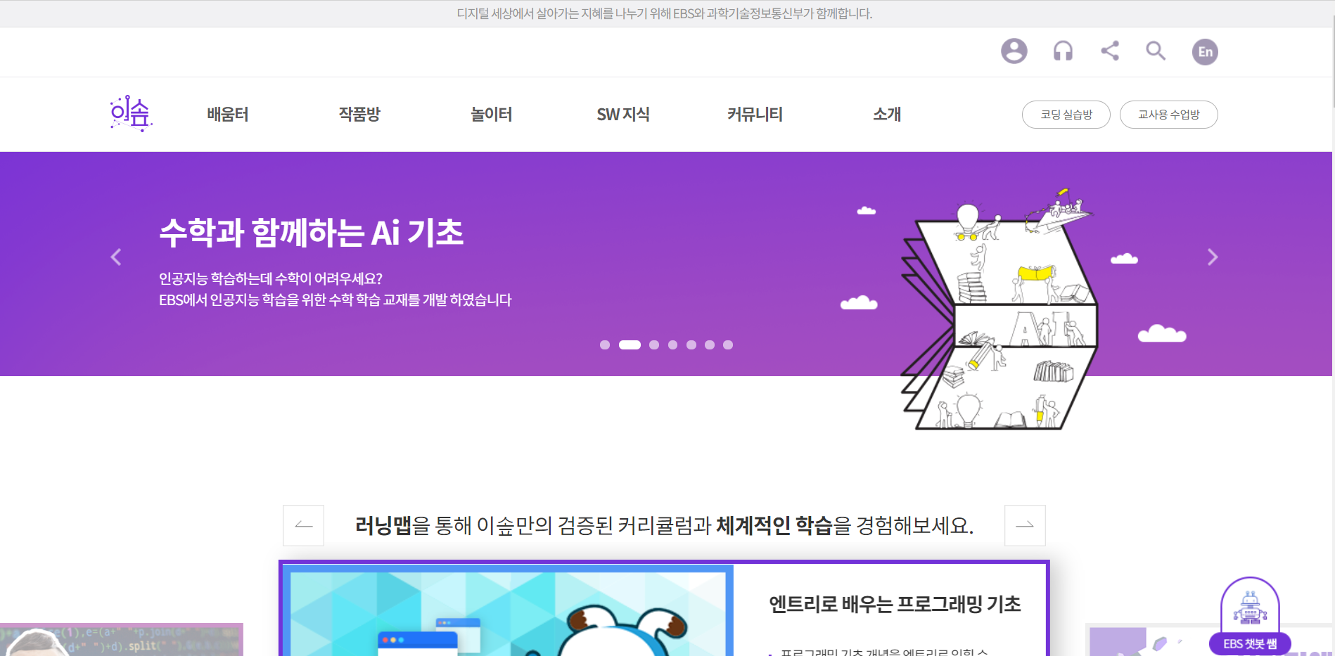 EBSμμ μ΄μνλ μννΈμ¨μ΄ κ΅μ‘ νλ«νΌμΌλ‘ μνΈλ¦¬, μ€ν¬λμΉ, ν μ€νΈ μ½λ©μ μ€μ΅ν΄λ³Ό μ μλ μ½λ© μ€μ΅λ°©μ΄ μμΌλ©° λ°°μν°μμλ λ€μν μννΈμ¨μ΄ κ°μλ₯Ό λ€μ μ μμ΅λλ€.