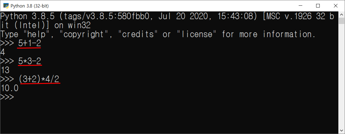 ํ์ด์ฌ ์ ธ >>> ๊ธฐํธ ๋ค์ ์ปค์๊ฐ ๊น๋นก์ด๊ณ ์์ต๋๋ค. ์ด๋ ํ์ด์ฌ์ด ์ฌ์ฉ์๊ฐ ์ ๋ ฅํ๊ธฐ๋ฅผ ๊ธฐ๋ค๋ฆฌ๊ณ ์๋ค๋ ๋ป์ ๋๋ค. ์ฌ์ฉ์๊ฐ ์ ๋ ฅ์ ํ๋ฉด ๋ฐ๋ก ๊ฒฐ๊ณผ๋ฅผ ๋ณด์ฌ ์ฃผ๋๋ฐ ์ด๊ฒ์ ๋ํํ ์ ธ ๋๋ ์ ธ์ด๋ผ๊ณ ๋ถ๋ฆ ๋๋ค. ๋ํํ ์ ธ์ ๋ช ๋ น์ ๋ด๋ฆฌ๋ฉด ๊ทธ ๊ฒฐ๊ณผ๋ฅผ ์ฌ์ฉ์๊ฐ ๋ฐ๋ก ๋ณผ ์ ์์ต๋๋ค.