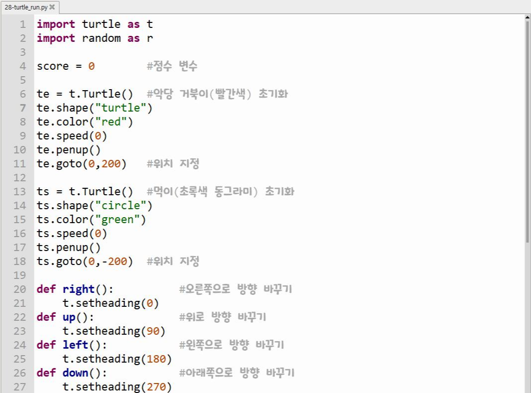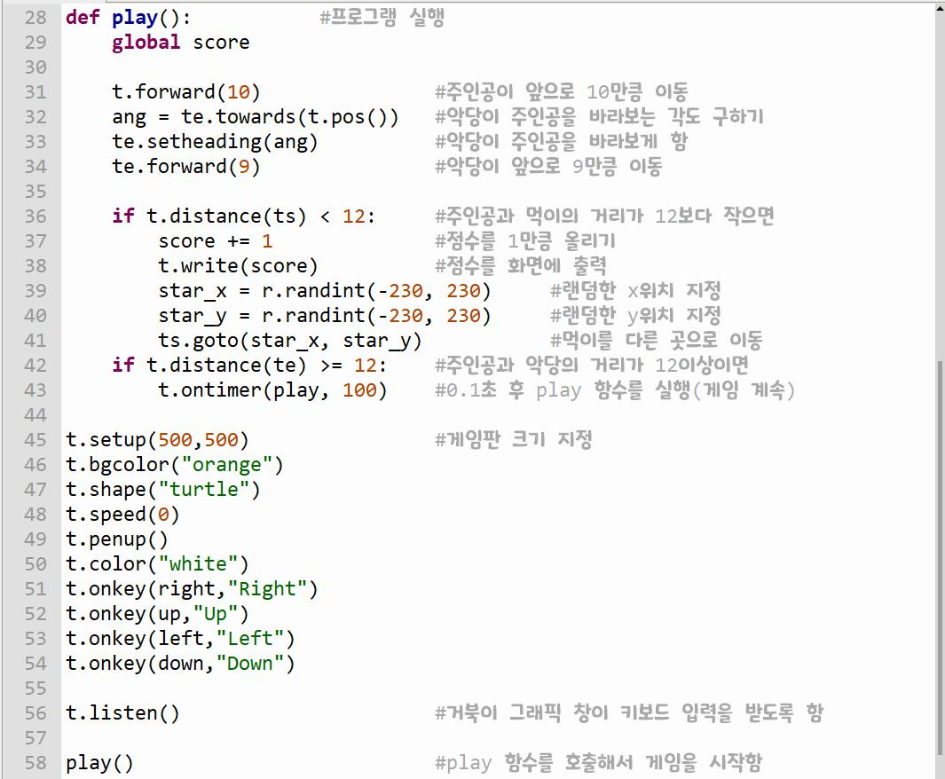 ๋น์ด ์์ผ๋ก 9๋งํผ ์ด๋ if t.distance(ts) < 12: #์ฃผ์ธ๊ณต๊ณผ ๋จน์ด์ ๊ฑฐ๋ฆฌ๊ฐ 12๋ณด๋ค ์์ผ๋ฉด score += 1 #์ ์๋ฅผ 1๋งํผ ์ฌ๋ฆฌ๊ธฐ t.write(score) #์ ์๋ฅผ ํ๋ฉด์ ์ถ๋ ฅ star_x = r.randint(-230, 230) #๋๋คํ x์์น ์ง์ star_y = r.randint(-230, 230) #๋๋คํ y์์น ์ง์ ts.goto(star_x, star_y) #๋จน์ด๋ฅผ ๋ค๋ฅธ ๊ณณ์ผ๋ก ์ด๋ if t.distance(te) >= 12: #์ฃผ์ธ๊ณต๊ณผ ์