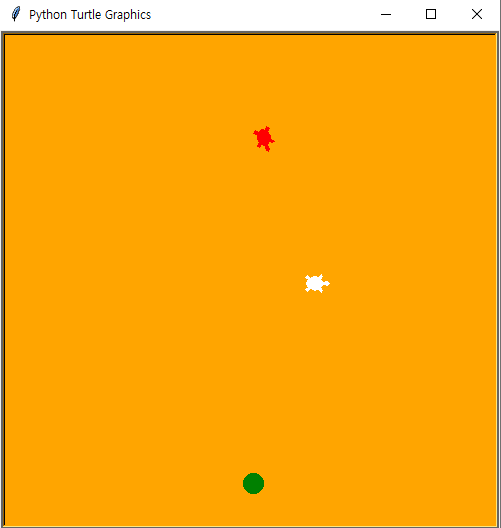 ts = t.Turtle() #๋จน์ด(์ด๋ก์ ๋๊ทธ๋ผ๋ฏธ) ์ด๊ธฐํ ts.shape("circle") ts.color("green") ts.speed(0) ts.penup() ts.goto(0,-200) #์์น ์ง์