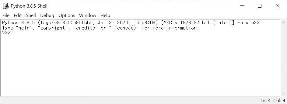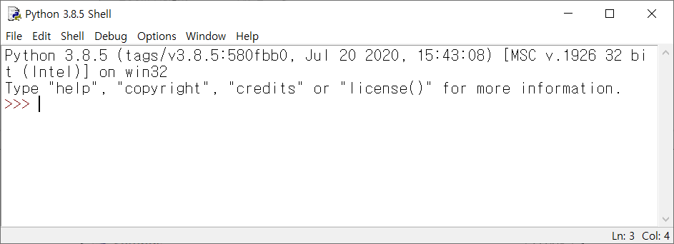 IDLE ํ๋ก๊ทธ๋จ IDLE ํ๋ก๊ทธ๋จ์ ์คํํ๋ฉด Python 3.8.5 Shell ์ฐฝ์ด ๋น๋๋ค. ์ด์ ์ ์ฌ์ฉํ๋ ์ ธํ๊ณ ๋ฐฐ๊ฒฝ ์๊น์ด ๋ค๋ฅด๊ณ ๋ฉ๋ด๊ฐ ์๊ฒผ์ต๋๋ค. ์ด์ ์ ์ฌ์ฉํ๋ ํ์ด์ฌ์ ๋ํํ ์ ธ ํ๋ก๊ทธ๋จ์ ๋ช ๋ น์ ํ ์ค์ฉ ์ ๋ ฅํ๋ฉด ๊ฒฐ๊ณผ๋ฅผ ๋ฐ๋ก ํ์ธํ ์ ์์ด์ ํธ๋ฆฌํ์ง๋ง ์ ๋ ฅํ ํ๋ก๊ทธ๋จ์ ์ ์ฅํ๋ค๊ฐ ๋ค์ ์คํํ๊ธฐ ์ด๋ ค์ฐ๋ฉฐ ์๋ฌ๋ฅผ ์์ ํ๊ธฐ๋ ๋ฒ๊ฑฐ๋กญ์ต๋๋ค.