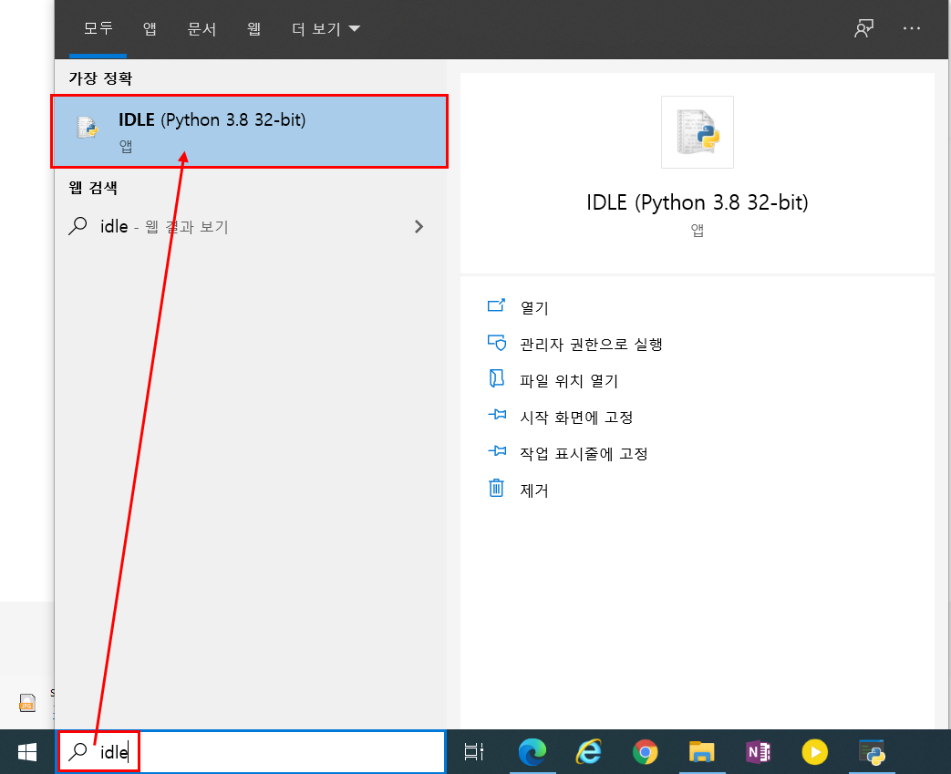 IDLE ํ๋ก๊ทธ๋จ ์คํ IDLE ํ๋ก๊ทธ๋จ์ ๊ฒ์ํ์ฌ ์คํํด ์ค๋๋ค.
