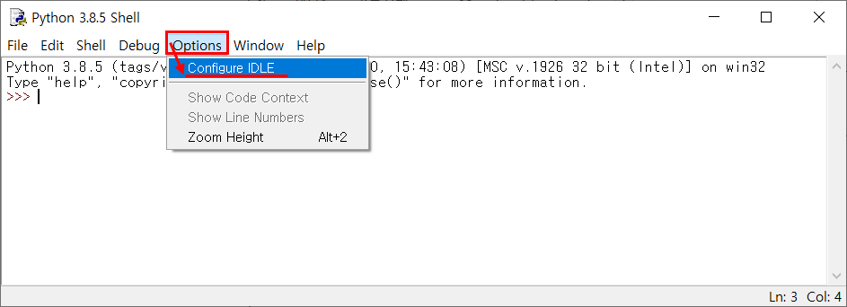 IDLE ํ๋ก๊ทธ๋จ ์ค์ ๊ธ์ ํฌ๊ธฐ์ ๊ธ๊ผด์ ๋ณ๊ฒฝํ๊ธฐ ์ํด Options ๋ฉ๋ด์์ Configure IDLE ์ ์คํํฉ๋๋ค.