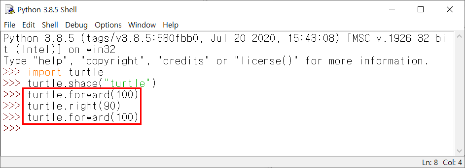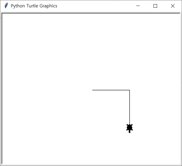 ์คํ ๊ฒฐ๊ณผ ์ค์ต2 ๊ฑฐ๋ถ์ด ์์ง์ด๊ธฐ >>> turtle.forward(100) >>> turtle.right(90) >>> turtle.forward(100)