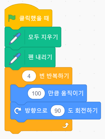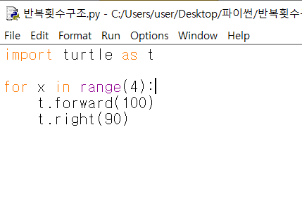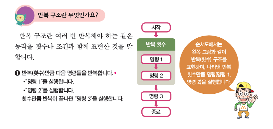 < ์ถ์ฒ : ์ํํธ์จ์ด์ ํจ๊ปํ๋ ์ฐฝ์๋ ฅ ์ฌํ > ๋ฐ๋ณต ๊ตฌ์กฐ๋ ๊ฐ์ ๋ถ๋ถ์ ์ฌ๋ฌ ๋ฒ ๋ฐ๋ณตํด์ผ ํ ๋ ์ฌ์ฉ๋ฉ๋๋ค. ์ด๋ ๊ฐ์ฅ ์ค์ํ ๊ฒ์ ๋ฐ๋ณต๋๋ ๋ถ๋ถ์ ๋ฌถ๋ ๊ฒ์ ๋๋ค. ์ฌ๊ฐํ์ ๊ทธ๋ฆด ๋ ๋ฐ๋ณต๋๋ ๋ถ๋ถ์ ์์ผ๋ก ์ด๋ํ๊ณ ํ์ ํ๋ ๋ถ๋ถ์ ๋๋ค. ์ด๋ฅผ ๋ฌถ์ด 4๋ฒ ๋ฐ๋ณตํ๋ฉด ์ฌ๊ฐํ์ด ๊ทธ๋ ค์ง๊ฒ ๋ฉ๋๋ค.