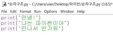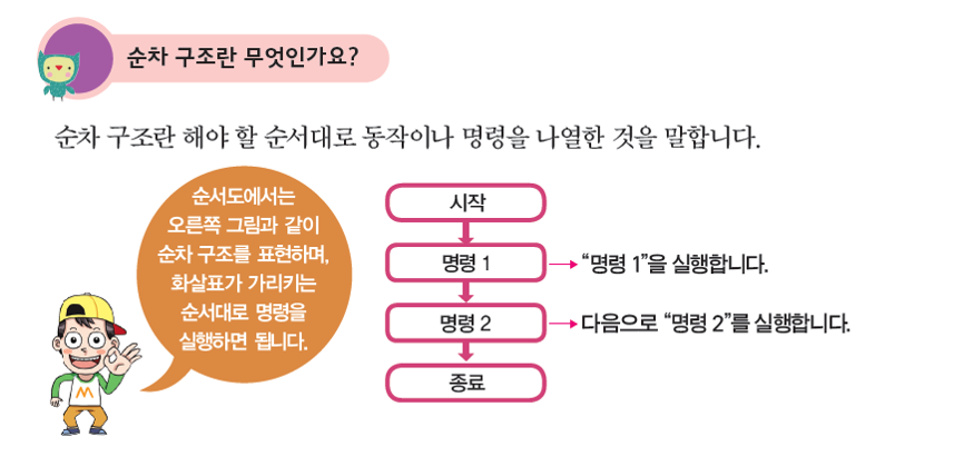 < ์ถ์ฒ : ์ํํธ์จ์ด์ ํจ๊ปํ๋ ์ฐฝ์๋ ฅ ์ฌํ > ์์ฐจ ๊ตฌ์กฐ๋ ํ๋ก๊ทธ๋จ์ ๋ง๋๋๋ฐ ๊ฐ์ฅ ๊ธฐ๋ณธ์ด ๋๋ ๊ตฌ์กฐ์ ๋๋ค. ํ๋ก๊ทธ๋จ์ด ๋ช ๋ น์ด๋ฅผ ์ ๋ ฅํ ์์๋๋ก ์คํ์ด ๋จ์ ์๋ฏธํฉ๋๋ค. ์๋ ๊ทธ๋ฆผ์ ์คํฌ๋์น์ ํ์ด์ฌ์ผ๋ก ๋ง๋ ๊ฐ์ฅ ๊ฐ๋จํ ์์ฐจ ๊ตฌ์กฐ ํ๋ก๊ทธ๋จ์ ๋๋ค.