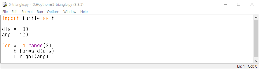 ์ผ๊ฐํ์ ๊ทธ๋ ค์ฃผ๊ธฐ ์ํด์ ang(๊ฐ๋ ๋ณ์) ๊ฐ์ 120์ผ๋ก ๋ฐ๊ฟ์ฃผ๊ณ ๋ฐ๋ณต์ 3๋ฒ ํ๋๋ก ๋ฐ๊ฟ์ค๋๋ค.